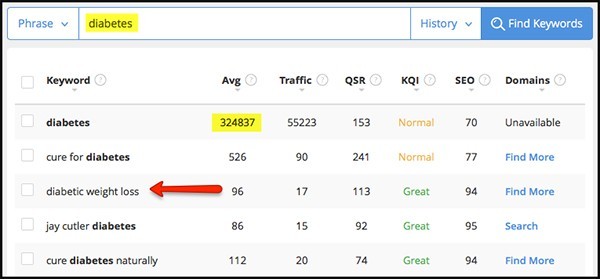 First, you want to find the number of searches in the broader niche. You’re looking for searches of at least 10,000 per month. Let’s see what “Diabetes” is…
