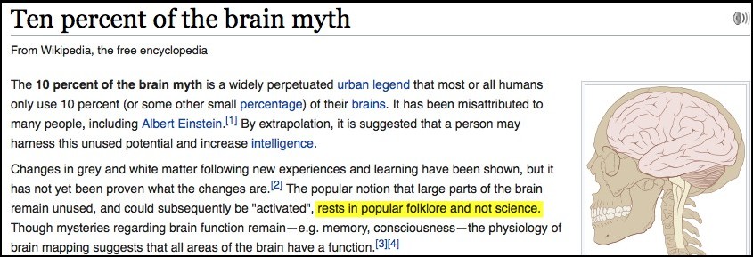 He claims to show you how to use 100% of your brain instead of the 10% that most of us use. This is a play on old folklore that claims we only use a small portion of our brain with much left untouched. Look at what Wikipedia says!